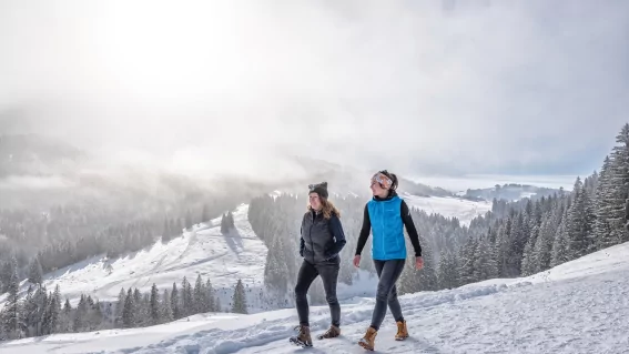 Schneeschuhe schnüren, Wintergear an und ab ins Schnee-Abenteuer. Beim Winterwandern in Oberstaufen wartet ein riesiges Winternetz an Winterwanderwegen auf Dich: Auf rund 60 Kilometern geräumten Strecken spazierst Du hier entspannt durch die verschneite Winterlandschaft und genießt dabei den Blick auf die Allgäuer Berge.